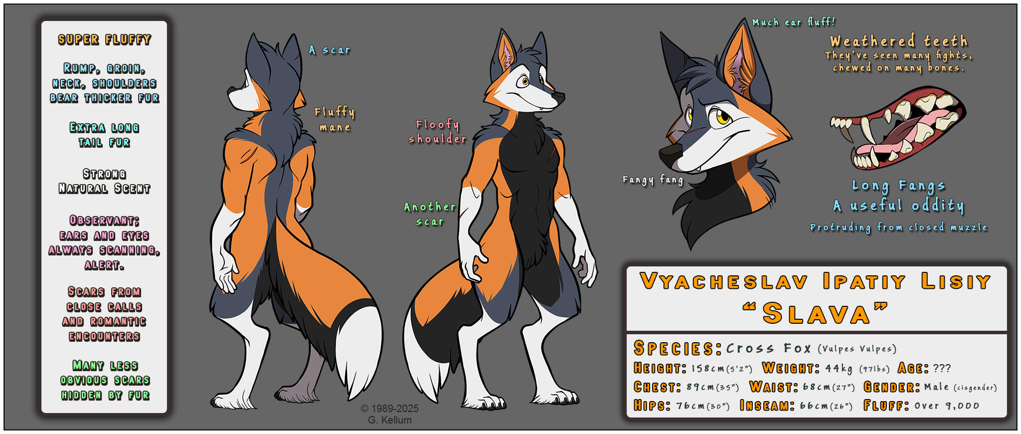 I'm going to attempt a brief real-world history of my fursona. As my fursona is of extreme importance in my identity and lifestyle, I feel that my fursona's roots and significance deserve some explaining.I created my fursona as a stand-in for myself in my imagined scenarios and fan fiction set in many fictional universes, such as Disney's Robin Hood, Sonic comics, TMNT, and basically any other media that featured animal characters of an anthropomorphic nature. I chose fox as his species due to deep feelings of connection with the species.When I was growing up, I had a lot in my life that I needed to escape. Slava was an effective way to do this. His earliest incarnation came in 1989, when I was only five years old, long before I discovered furry, in 1996. Imagine my shock and excitement upon finding other people with their own animal characters!